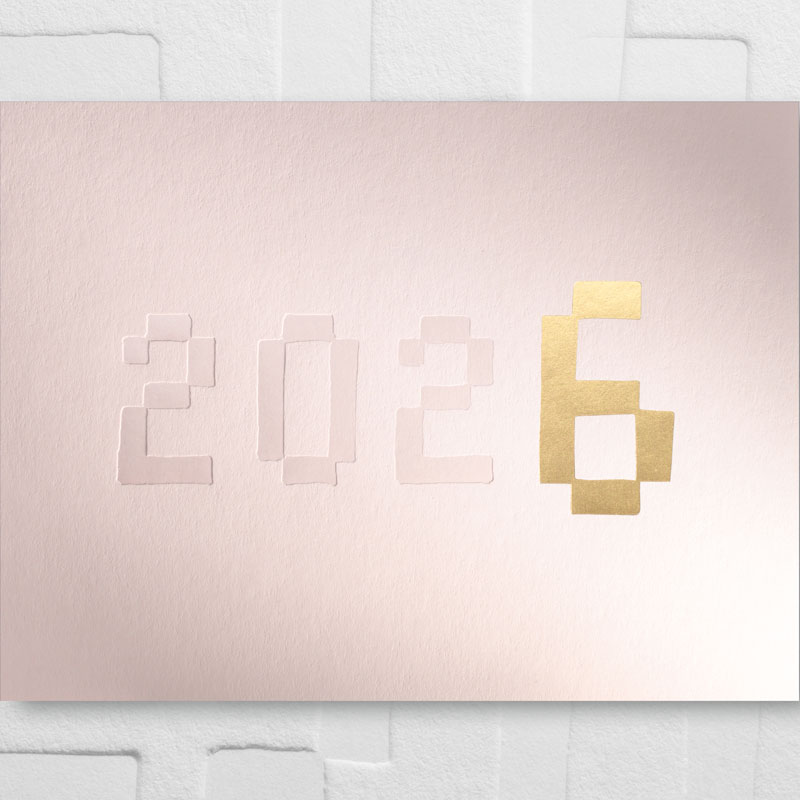 Votre carte de vœux 2026 est double, en 270-300 grs, au format 12 x 16 cm. Elle est accompagnée de son feuillet double gravé et de son enveloppe Blanc Naturel 120 grs.
